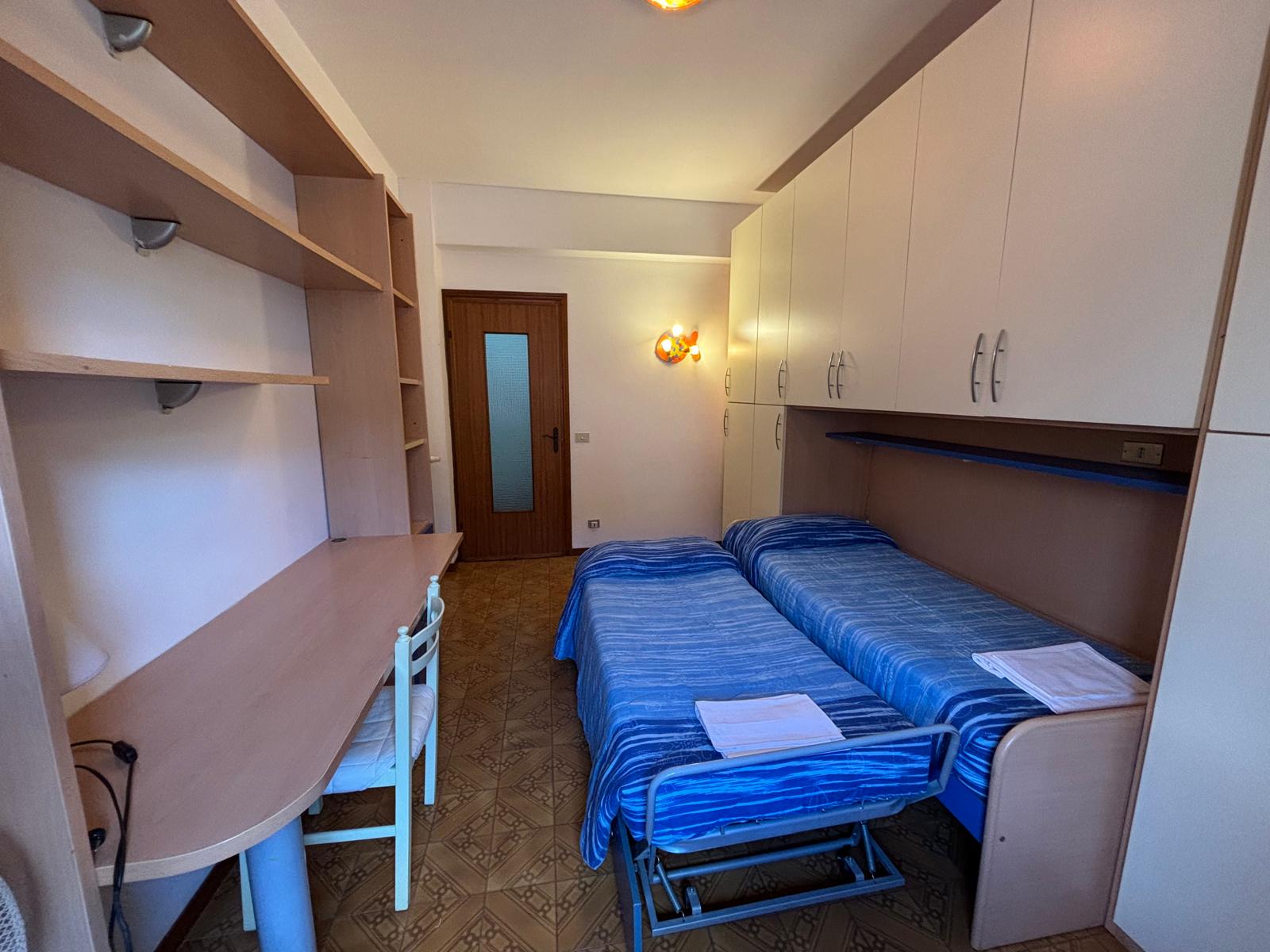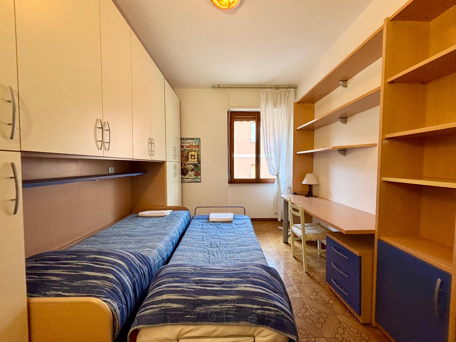 L’appartamento è composto da una camera da letto matrimoniale, una camera con 2 letti singoli, un bagno, una cucina con poggiolo e un ampio soggiorno Tv con divano e accesso a un lungo balcone.